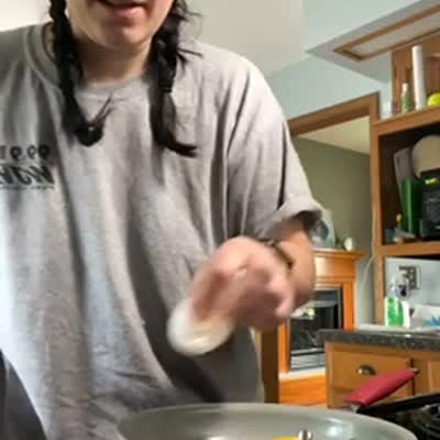 A young woman cracks an egg into a pan and talks about how she did not even get shell fragments into it in a kitchen, then she cracks a second egg onto the counter and gasps.