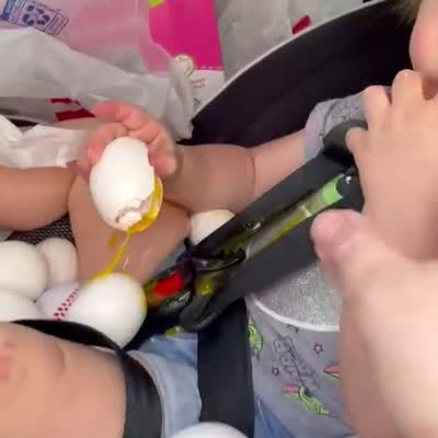 A woman laughs and gasps as she opens her car door and sees her tot daughter with cracked eggs in her lap.