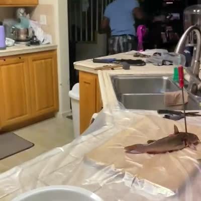A man cuts into a fish before its tail flaps which sends him into a tizzy as he runs out of the kitchen and gasps.