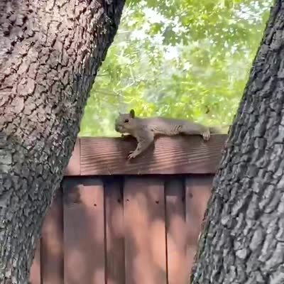 A woman films a squirrel that sits on a fence in a yard, then she gasps and ducks down when it jumps at her.