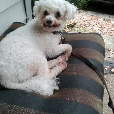 Two Bichon Frise dogs look out the window and bark at home, then a woman gasps loudly and says "oh my gosh, America's Funniest Home Videos is on." They turn around and run toward her.