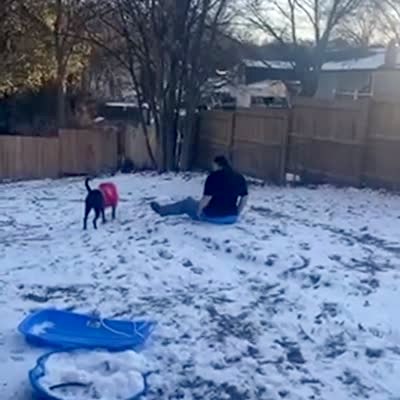 A man sits on a sled in a snowy backyard. He slides down the sloped yard straight into a fence. He hits the fence, and the fence falls over. The woman behind the camera gasps, screams and laughs.