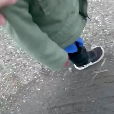 A tot boy pulls a ball out of a pile of mud. He realizes he got mud on his mittens, then he says to his grandpa, "Mommy's not gonna like that!"