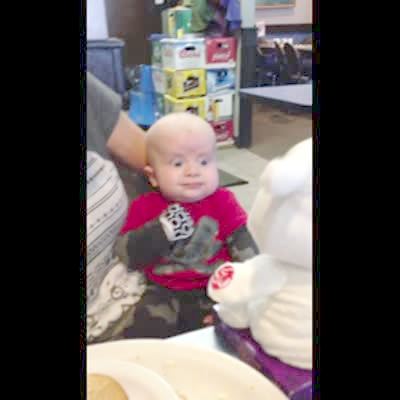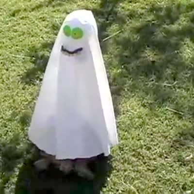 A baby boy wears a terrified expression as he watches a dancing and singing ghost Halloween decoration at home.