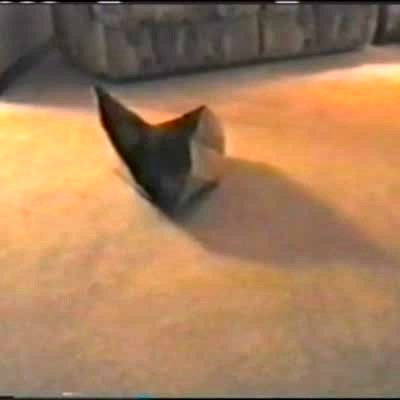 Small puppy dog plays in a paper bag. Bag looks like it's moving by itself until dog sticks its head out. Funny visual.