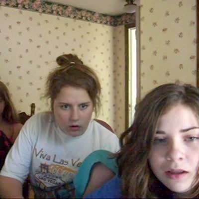 Teen girls play "find the ghost" game on a computer. Scary picture pops up, girls scream and get scared. Practical joke / prank