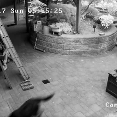 A young girl runs down her driveway and cries when a Halloween decoration makes a ghost noise. Security footage.
