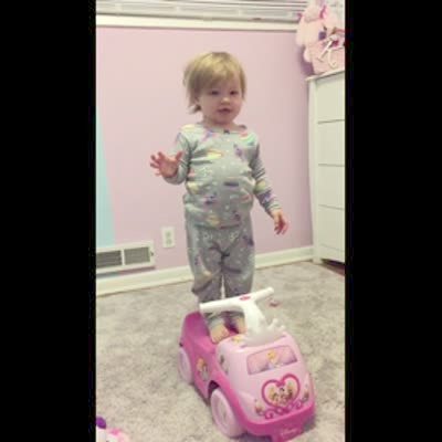 A tot girl stands on top of a toy car. A tot boy then comes over and pushes the car. The tot girl falls down.