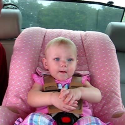 Baby girl in pink car seat talks to dad in complete gibberish. She really gets animated. Cute.