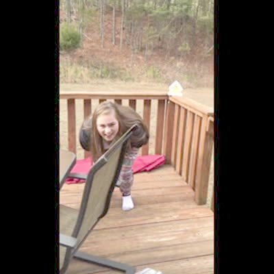 A woman swings a bat to hit a gingerbread house but misses and hits the railing on a deck. She swings the bat again to break the gingerbread house.