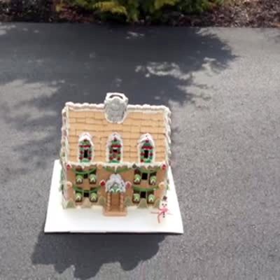 Little girl sways back and forth singing a song about her gingerbread house that she's holding, the house falls apart. Christmas.