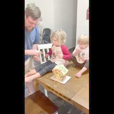 A young girl and tot girl sit on a kitchen table. A man tries to smash a gingerbread house but when he punches it the house doesn't break and he hurts his hand.