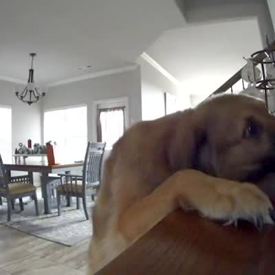 A dog puts its paws on a buffet table and takes a whole Gingerbread house off of it in a dining room. Security camera footage.