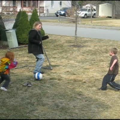 Boy kicks a soccer ball through a net while man stands in front as goalie. Ball hits tot girl in the head behind the net & she falls down. Short tails.