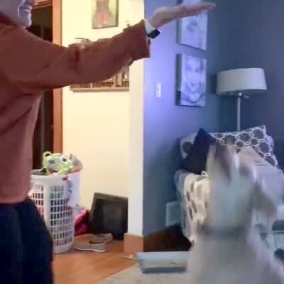 A Goldendoodle dog jumps up and catches a drone that a woman flies in the living room.