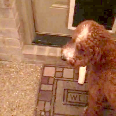 A woman tells her Goldendoodle dog he has to figure out how to get through the doggy door with his bone. The dog drops the bone and goes through the door, then reaches through to grab his bone.