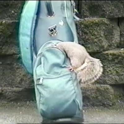 Two goats corn from a large bag in a golf cart. A woman sneaks up on them and screams. The goats jump awkwardly out of the cart and faint, then eventually come to and walk away.