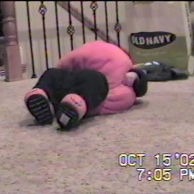 Halloween boy in pumpkin costume falls backwards and can't get up