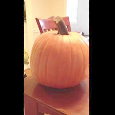The man behind the camera shows the camera his pumpkin which appears to have a butt crack on the other side.