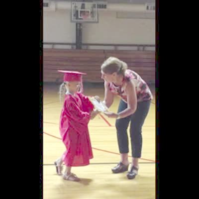 A young girl misses her chair and sits on the floor after receiving her diploma at her preschool graduation.