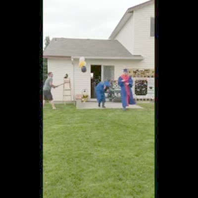 A teen boy gets into a vehicle with his mom and brother on his graduation day, when his brother shoots a confetti cannon at him, and it nails him in the face.