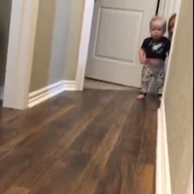 A tot boy walks down a hallway when his grandpa jumps out and scares him and he turns around and walks away.