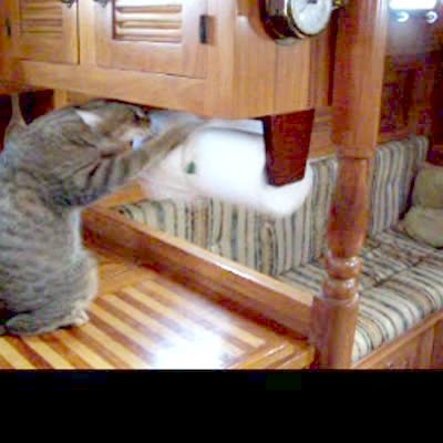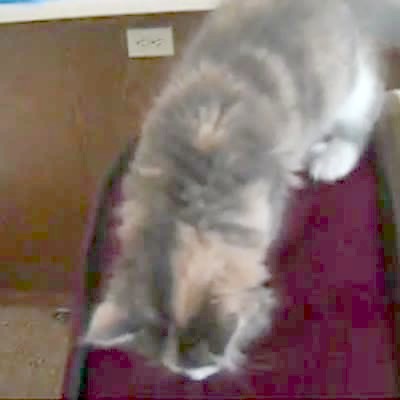 Gray cat is shot up close and his eyes move around when his arms are spread open wide. Macarena plays over clip. Weird.