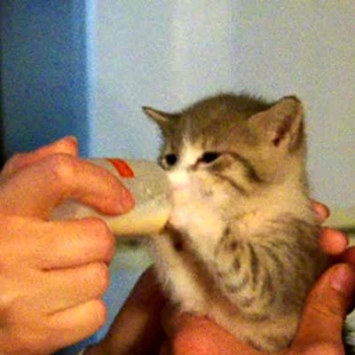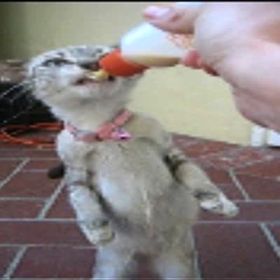 Little gray kitten stands on its hind legs and drinks from a milk bottle. Cute. Cat