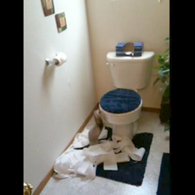 Gray ferret tears up a roll of toilet paper in the bathroom. It hangs from the roll by its teeth, looks like it's doing exercise pull ups. Pets.