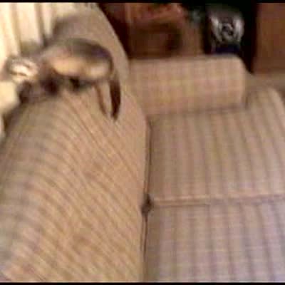 Gray cat lays on window sill as a ferret tries to jump up from the top of the couch and join him. Ferret falls to the ground.