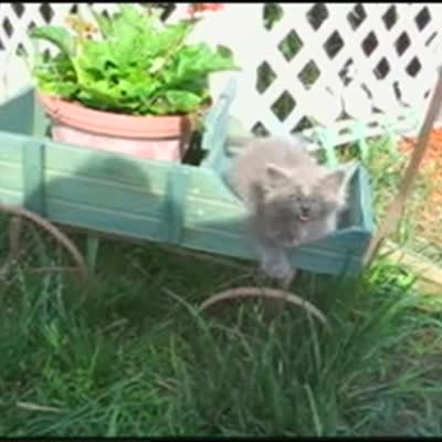 Gray kitten jumps toward the camera & looks funny. Cat.