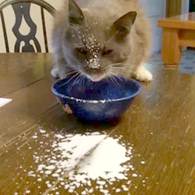 A gray cat spills everywhere as she drinks her milk out of a bowl.