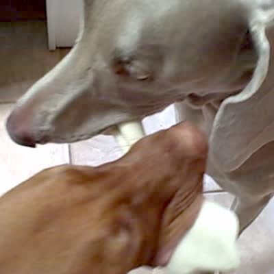 Chocolate lab dog and a gray lab dog are in the kitchen biting on a large chew bone and standing perfectly still. They don't move.