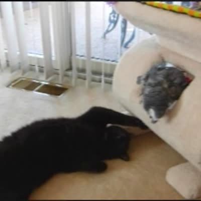 Black cat play fights with a gray parrot, then the bird says "Stop it" very sternly to the cat. Talking pet.