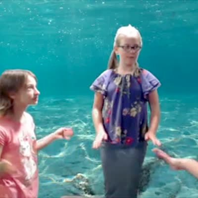 A young girl falls in a basement and knocks over a green screen while she wears a mermaid flipper dress.