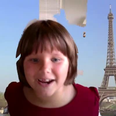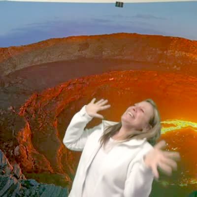 A woman yells "I'm melting" and pretends to shrink at a school, but she crashes into a green screen backdrop and knocks it down as she falls.