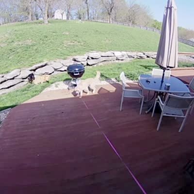 A teen boy walks a dog into the yard and the dog's leash gets tangled around a charcoal grill then the dog runs off and drags the grill and the boy with him. Nest security camera footage.