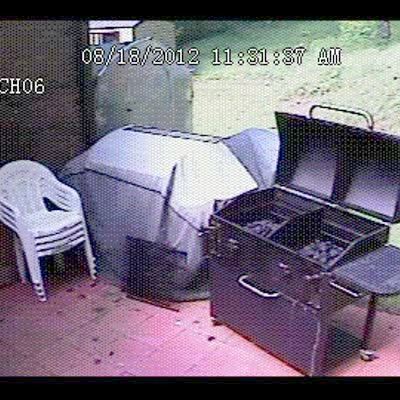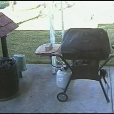 A man tries to pull a propane grill off the back porch of a home, but trips and falls into the back yard. Security footage.