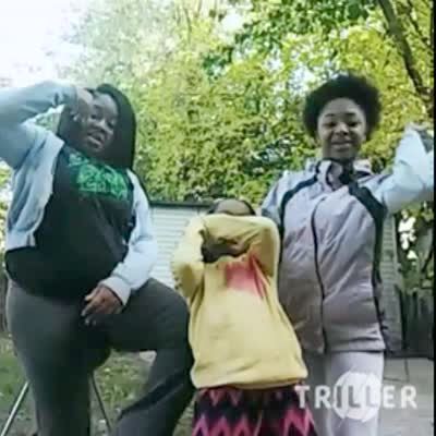 Two teen and a young girl dance along with a song. One of the teen girls falls backwards and hits her head on a grill.