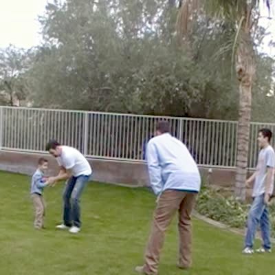 Two men and two boys play football in a yard. The younger boy runs with the ball, rolls over and hits his head on a covered grill.