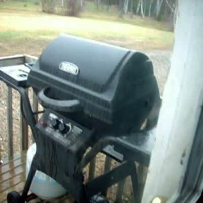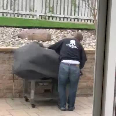 A man stands on a porch next to a barbecue grill, then a piece of aluminum foil is blown by wind off of a dish of food, and it covers his face. Security footage.