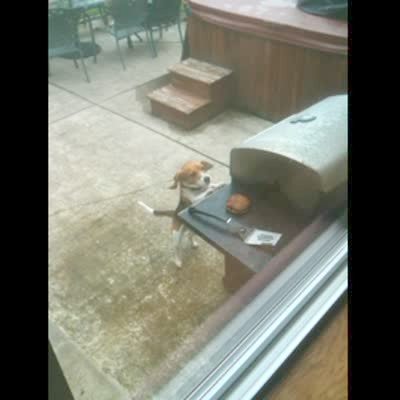 A Beagle dog jumps up on a grill so she can steal a burger outdoors.