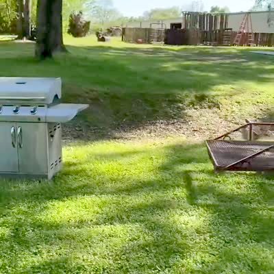A man opens up a grill on a back porch. A squirrel runs out of the grill and away. (2103)