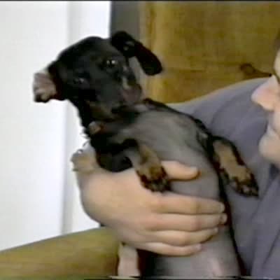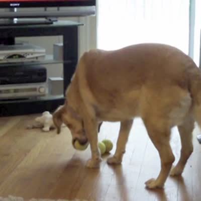 A woman finds her dog with shredded pillow fuzz on the floor and asks if he did it, and the dog grins and acts guilty.