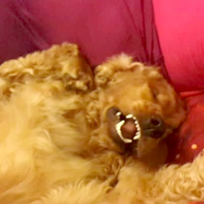 A dog sleeps on his back with his mouth and eyes hanging open and his teeth showing. Funny visual