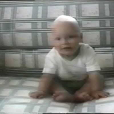 The camera man man blows on a baby boy's face. The baby boy makes a cute surprised cross eyed face at the camera.