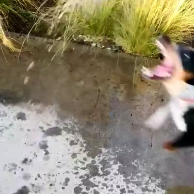 An Australian cattle dog jumps up every time a woman sprays a garden hose at home.
