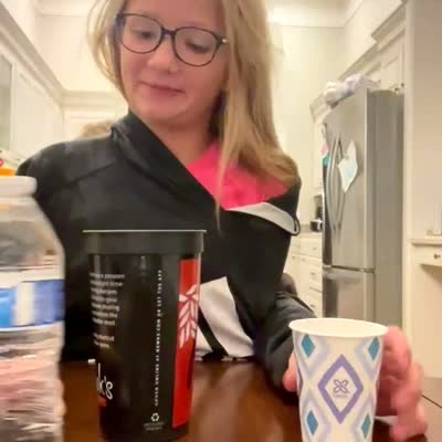 A young girl pours a glass of water in a kitchen while a young boy pretends to be her hands, but the young boy sprays her in the face with the water.