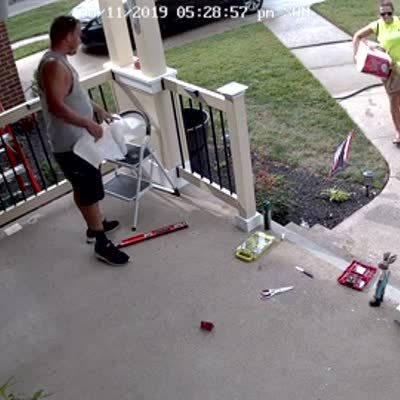 A senior man drops a bottle of soda on a porch step, then it bounces and the carbonation pops the cap off and spills it on the ground. Security camera footage.