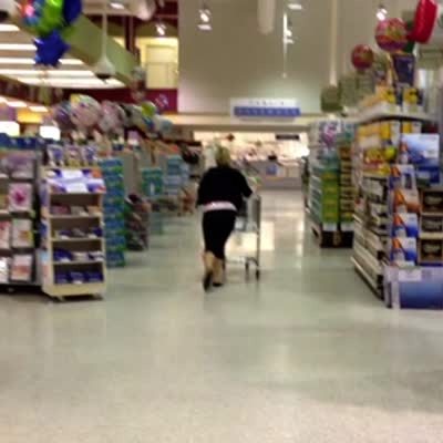 A girl rides across a grocery store aisle in the super man position on top of a cart. Action at :04.